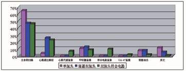 圖2 從2001年7月-2002年6月調研10家單探頭用戶、5家普通雙探頭用戶和30家雙探頭可變角度帶有符合電路用戶臨床檢查類型的數據。為了便于比較,采用相對數的方法。可以看出對于單探頭用戶在臨床主要用于骨掃描和甲狀腺檢查。對于雙探頭帶有符合電路系統的用戶,骨掃描46%、心肌血流灌注23%、符合電路10%、甲狀腺9%、心肌代謝7%、GA-67為2%,其它(腎臟、肝等)3%。可以看出雙探頭符合電路系統最大的貢獻是為臨床開拓出20%新的檢查項目,最為重要的是這些檢查項目將成為主流臨床檢查。這可能是雙探頭(多探頭)符合電路在國內急劇增加的主要原因。